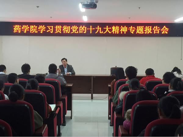 11月25日下午,藥學(xué)院黨的十九大精神走進(jìn)青年大學(xué)生活動(dòng)暨首場(chǎng)宣講報(bào)告會(huì)在實(shí)驗(yàn)教學(xué)綜合樓1604會(huì)議室舉行。校黨委宣傳部部長(zhǎng)潘榮華教授應(yīng)邀為學(xué)院青年大學(xué)生宣講黨的十九大精神,并以“放飛青春夢(mèng)想,書寫人生華章”勉勵(lì)青年大學(xué)生把青春年華匯入新時(shí)代奮進(jìn)新征程。宣講會(huì)由藥學(xué)院黨委書記袁方主持。