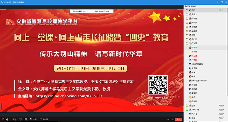 直播課上,錢斌教授和金文斌教授圍繞“傳承大別山精神,譜寫新時(shí)代華章”主題,從“英雄”、“復(fù)興”、“創(chuàng)新”、“信念”四個(gè)方面展開論述,進(jìn)一步推動(dòng)對(duì)黨史、新中國(guó)史、改革開放史、社會(huì)主義發(fā)展史的學(xué)習(xí)教育。同時(shí)引領(lǐng)學(xué)子踐行大別山精神,感受革命洗禮;探尋紅軍長(zhǎng)征的偉大歷程,傳承紅色基因;牢記初心和使命,爭(zhēng)做時(shí)代新青年。