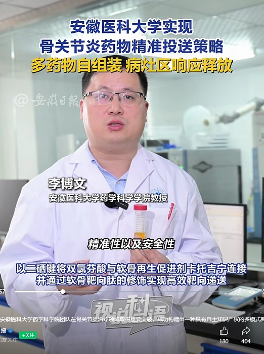 《安徽日報》報道了國家級人才項目獲得者,我院李博文教授團隊在骨關(guān)節(jié)炎多模式治療領(lǐng)域取得的重大進展。該團隊創(chuàng)造性地構(gòu)建出一種具有自主知識產(chǎn)權(quán)的多模式智能藥物遞送系統(tǒng),為骨關(guān)節(jié)炎的精準與多模式治療提供了全新思路。