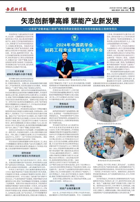 《安徽科技報》以“矢志創(chuàng)新攀高峰 賦能產(chǎn)業(yè)新發(fā)展”為題,對首屆“安徽卓越工程師”稱號獲得者、我院高級工程師李鳳和進行了深度報道。李鳳和多年來堅守科研一線,致力于推動藥用輔料國產(chǎn)化、綠色工藝開發(fā)和新藥創(chuàng)制,在解決行業(yè)“卡脖子”難題、促進產(chǎn)業(yè)轉(zhuǎn)型升級等方面取得了顯著成就。